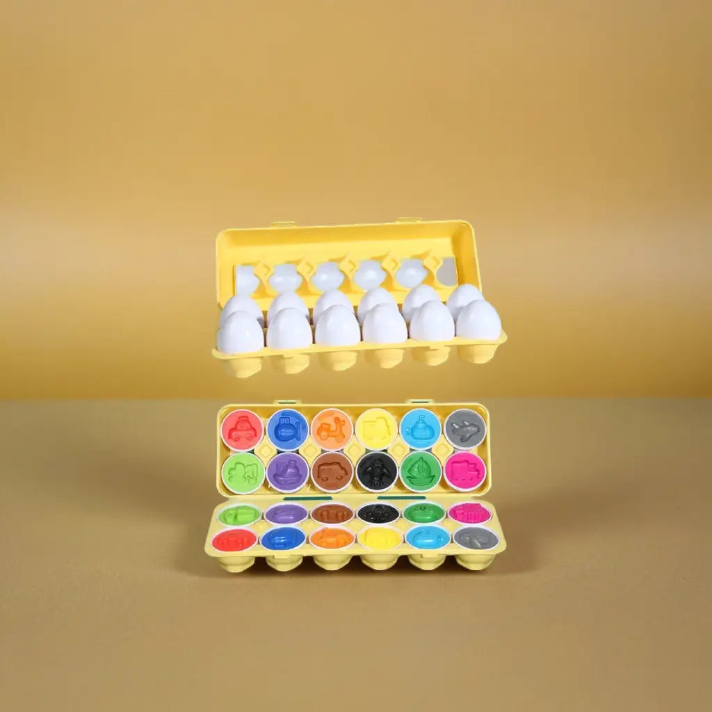 🎨 12 œufs colorés assortis : chaque œuf s’ouvre pour révéler une couleur et une forme unique.